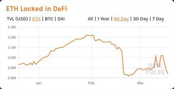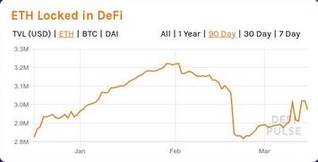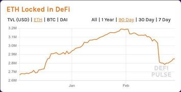 Видим результаты первого (зимнего) хайпа - с начала 2020 года заблокированные в DeFi средства практически удвоились за полтора месяца. После этого в 20-х числах февраля мировые финансовые рынки развернулись, и началось падение. Падение суммарного количества ETH, замороженного в DeFi, выглядит особенно резким, поскольку курс ETH/USD тоже начал сильно валиться. Гарантийное обеспечение DeFi-"залогов" стало катастрофически быстро снижаться, что привело к их массовому принудительному закрытию.